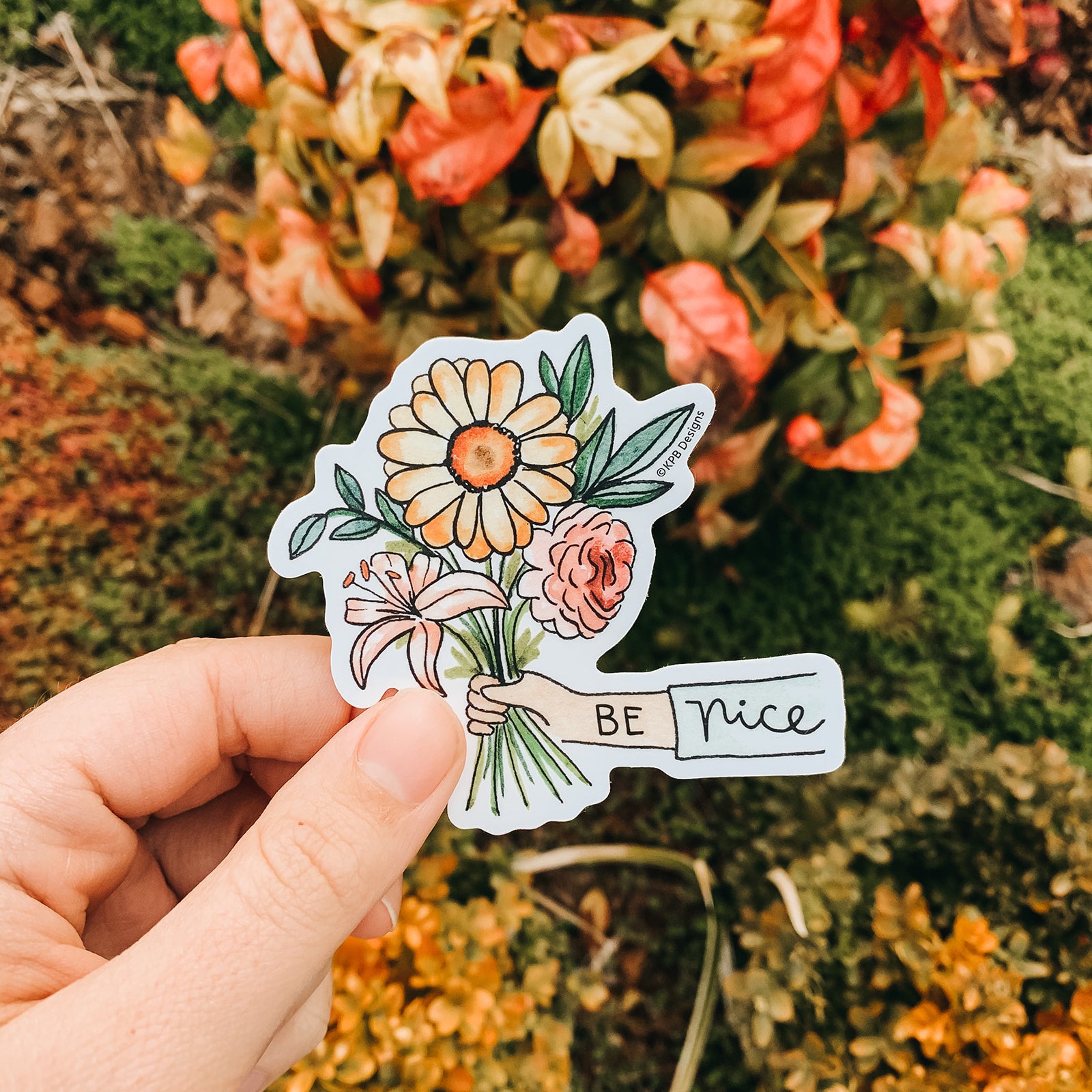 Put a smile on your belongings with this 3"x3" Be Nice sticker by Kpb Designs. Made of thick vinyl with a UV laminate, this durable and waterproof sticker resists scratching, rain, and sunlight. It also can survive in the dishwasher! Show off your style and stay positive with this fun accessory.